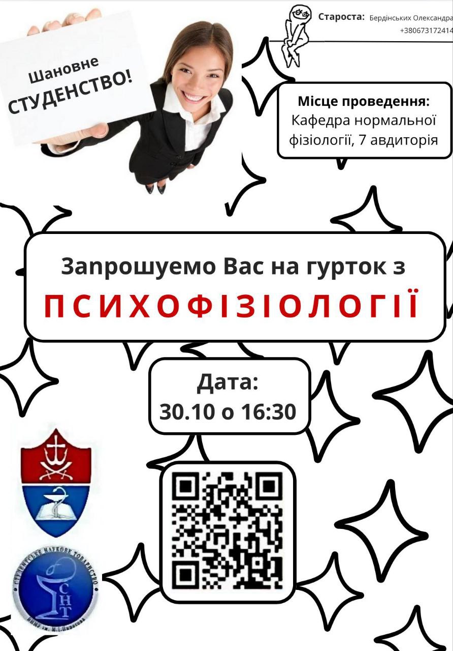 30.10.25р. о 16.00. відбудеться засідання студентського психофізіологічного наукового гуртка (кім №7 кафедри нормальної фізіології)