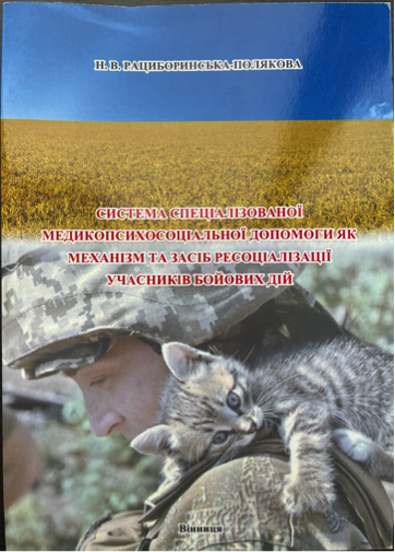 -Рациборинська-Полякова Н.В. Система спеціалізованої медикопсихосоціальної допомоги як механізм та засіб ресоціалізації учасників бойових дій./ Рациборинська-Полякова Н.В./- Вінниця, рекомендовано до друку Вченою Радою ВНМУ ім. М.І. Пирогова протокол №10 від 30.05.2019р., 232 с., 4,7 др.арк.;