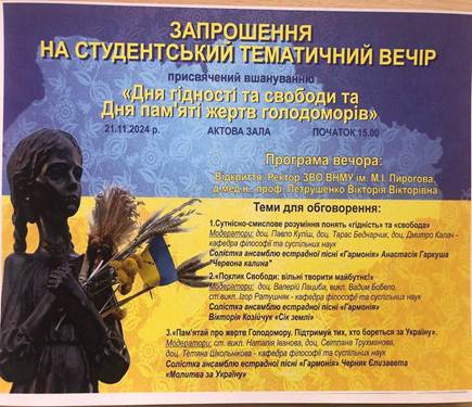 - 21.11.24 – Організація студентів у проведенні студнтського тематичного вечора присвяченого вшануванню «Дня гідності та свободи та Дня пам`яті жертв голодоморів»