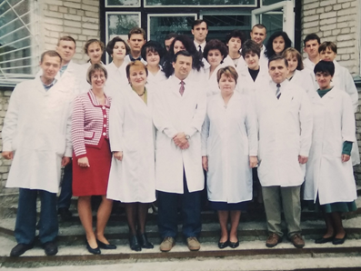1998 рік – В першому ряду (зліва направо) клінічний ординатор Заїка С.В., старший лаборант Павлова О.В., ас. Палій І.Г., проф. Чернобровий В.М., доц. Півторак Н.А., доц. Черешнюк Л.В., аспірант Резніченко І.Г.