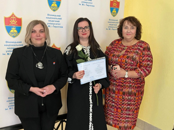 Ректор ВНМУ проф. Вікторія Петрушенко урочисто вручає диплом доктора філософії асистенту Аллі Капітун, поруч – науковий керівник проф. Ірина Палій (30.10.2025 р.)