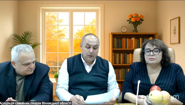 Під час онлайн-трансляції майстер-класу для сімейних лікарів 28.10.2025 р. На фото проф. Жебель Вадим Миколайович, доц. Заїка Сергій Володимирович, проф. Палій Ірина Гордіївна.
