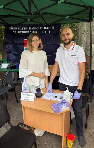 Медична локація кафедри внутрішньої та сімейної медицини під час Дня міста 14 вересня 2025 р. На фото: асистенти Катерина та Олег Ксенчини.