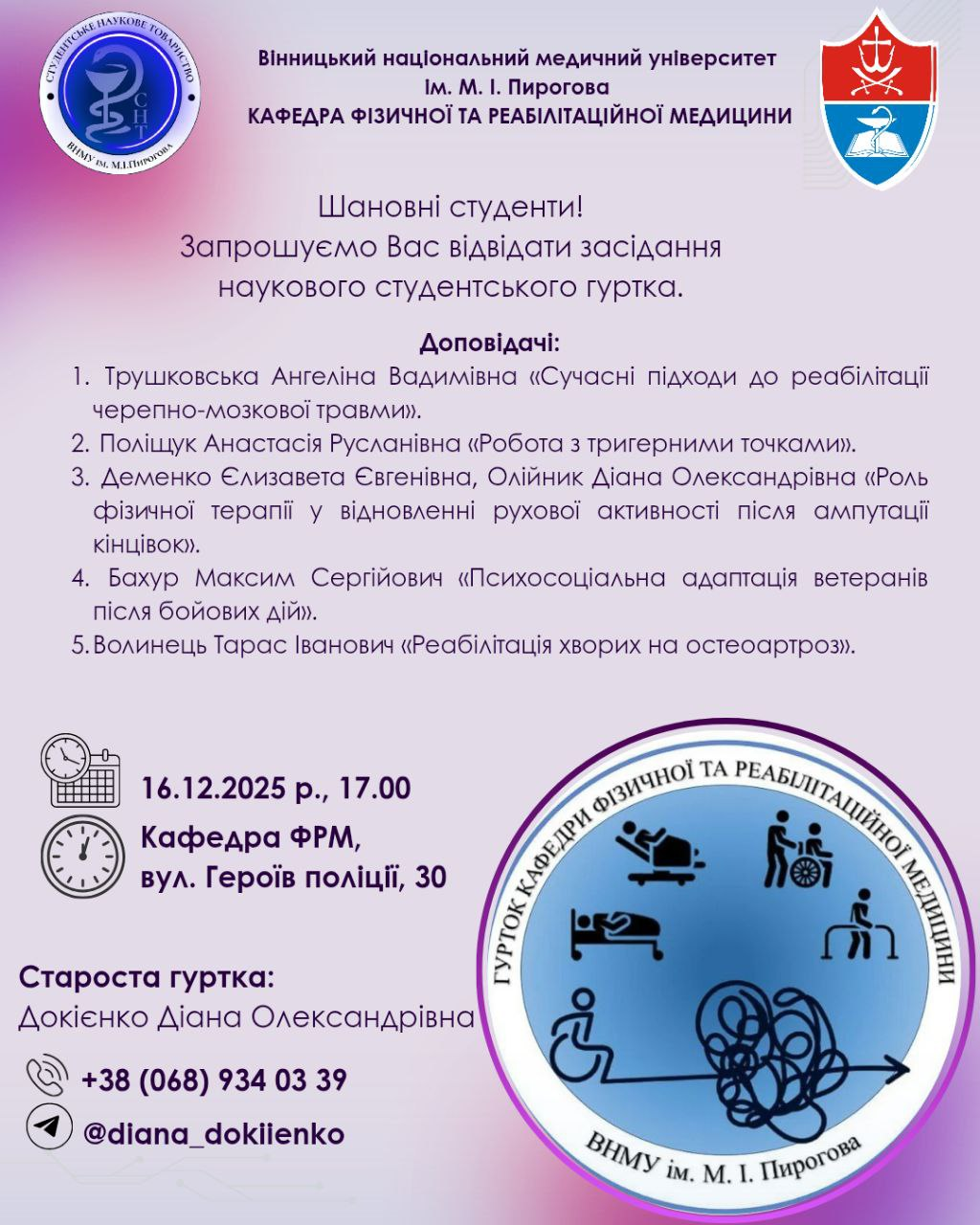 На кафедрі фізичної та реабілітаційної медицини пройшло засідання студентського гуртка на тему: «Комплексна реабілітація: мультидисциплінарна взаємодія та ефективні стратегії».Учасники зосередили увагу на важливості узгодженої роботи мультидисциплінарної команди у відновленні функціональних можливостей пацієнтів. Обговорювалися ефективні стратегії реабілітації, що поєднують медичні, фізичні, психологічні та соціальні компоненти, а також їх вплив на результативність лікування.