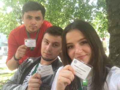 Студенти 4 курсу ВНМУ: Пудрій Володимир, Гуменюк Максим та Черкаська Наталія під час реєстрації на конференції у місті Грац.