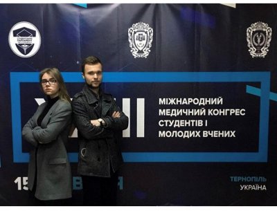Циба Роман та Пастух Олена під час реєстрації у ТДМУ. Отримали диплом 3го ступеню. Науковий керівник роботи - Мусієнко Д.В.