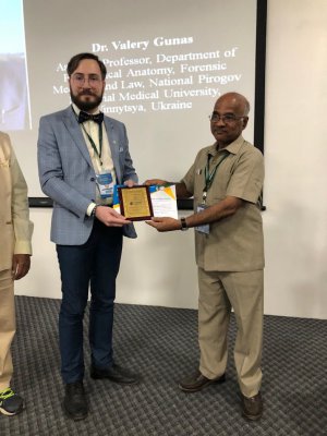 Асистент кафедри Перебетюк А.М. знайомить індійських колег зі структурою судово-медичної експертної служби в Україні. Нагородження асистента кафедри Гунаса В.І. після доповіді (Хайдерабад, Індія).