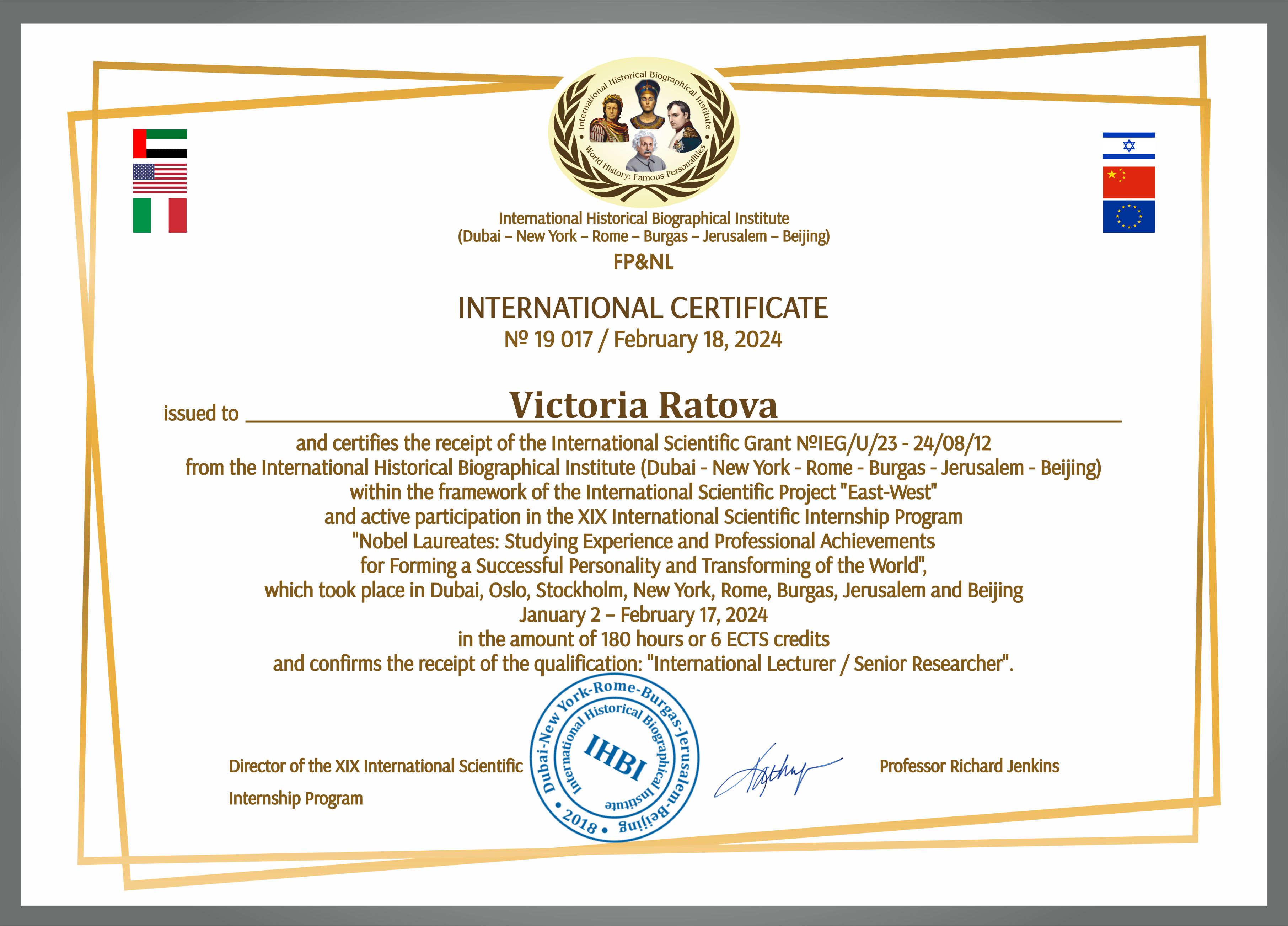 XIX Міжнародна програма наукового стажування «Nobel Laureates: Studying Experience and Professional Achivements for Forming a Successful Personality and Transforming of the World» («Нобелівські Лауреати: Вивчення Досвіду та Професійних Досягнень для Формування Успішної Особистості та Трансформації Оточуючого Світу») у Дубаї, Осло, Стокгольмі, Римі, Бургасі, Нью-Йорку, Єрусалимі, Пекіні, яка була організована International Historical Biographical Institute в рамках Міжнародного наукового проекту "Схід-Захід", 2 січня – 17 лютого 2024р., тривалість навчання 6 ECTS/180 годин. Сертифікат №19016 від 18.02.2024.
