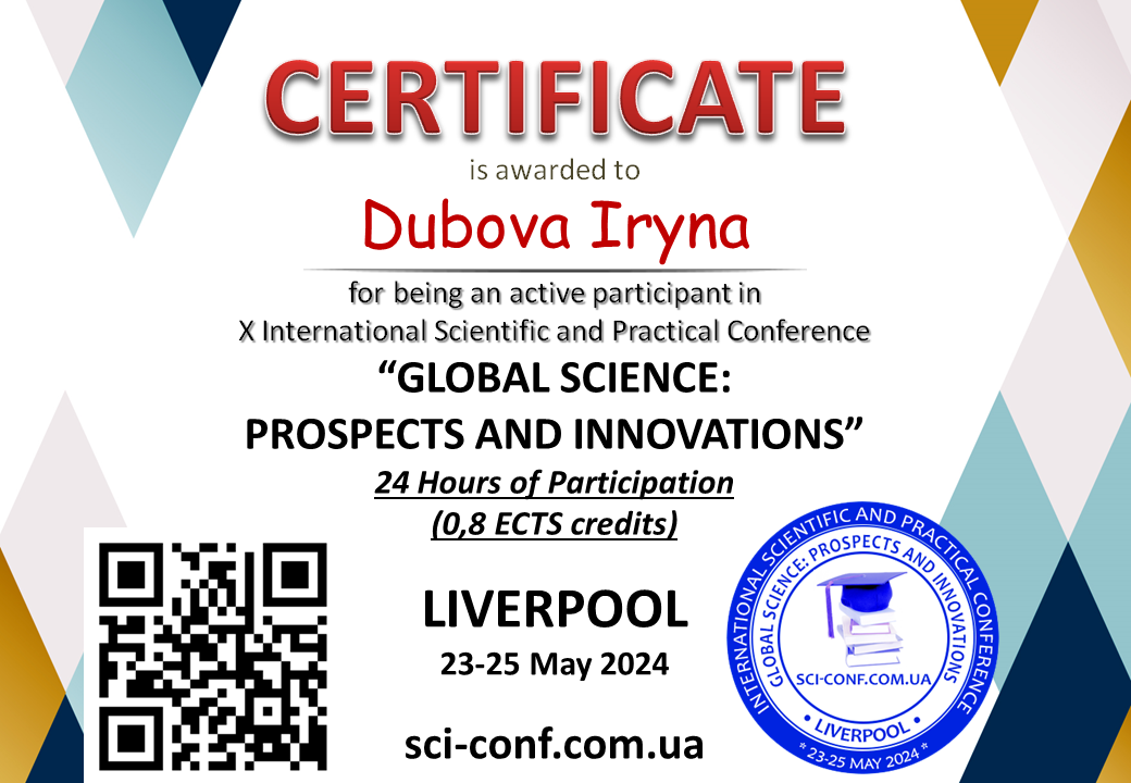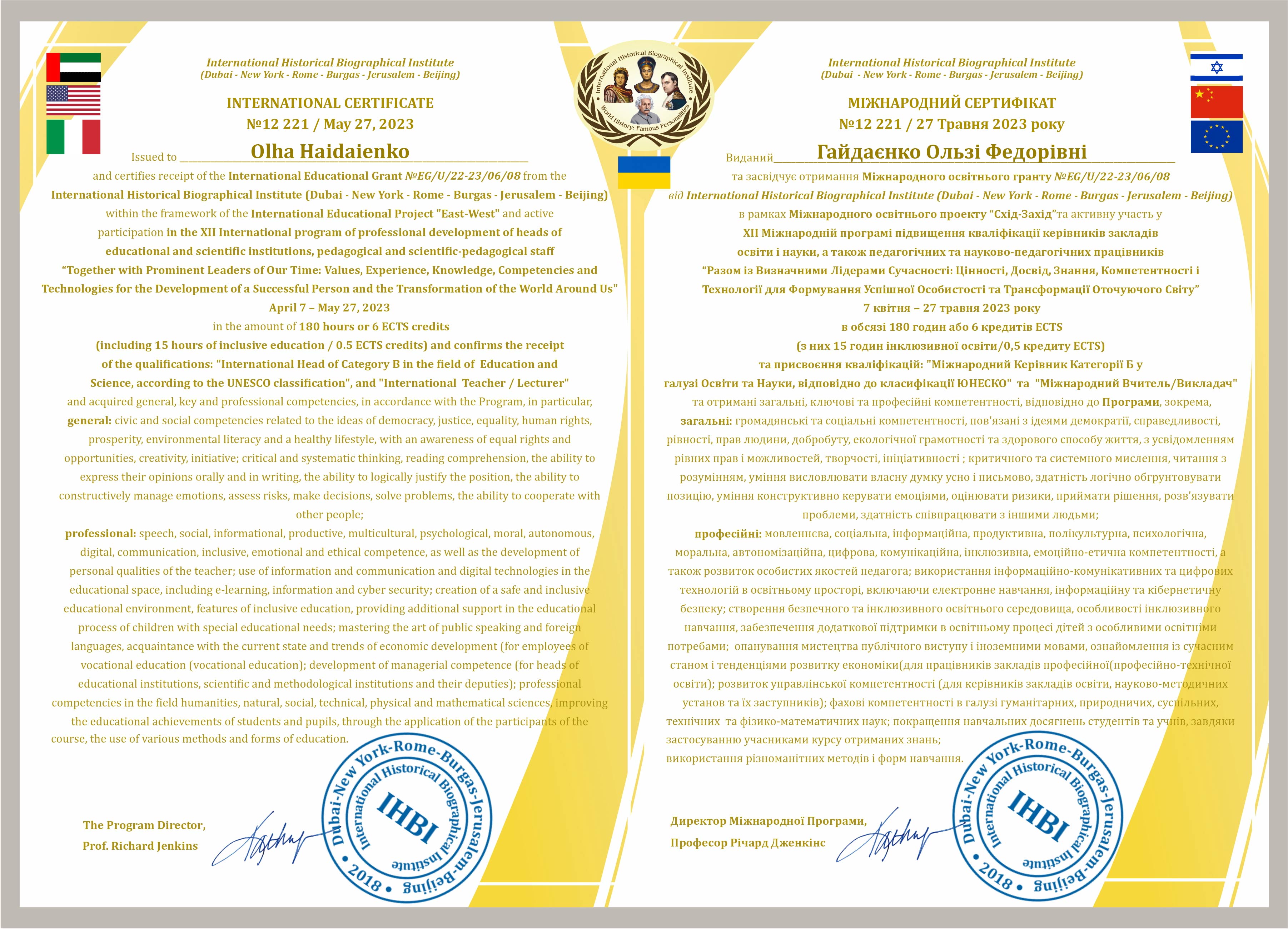 XІІ Міжнародна програма наукового стажування «Together with Prominent Leaders of Our Time: Values, Experience, Knowledge, Competencies and Technologies for the Development of a Successful Person and the Transformation of the World Around Us» («Разом із Визначними Лідерами Сучасності: Цінності, Досвід, Знання, Компетентності і Технології для Формування Успішної Особистості та Трансформації Оточуючого Світу»), яка була організована International Historical Biographical Institute (Dubai – New-York – Rome – Burgas – Jerusalem – Beijing), 7 квітня – 27 травня 2023р., тривалість навчання 6 ECTS/180 годин (з них 15 годин інклюзивної освіти/0,5 кредиту ECTS). Сертифікат №12221 від 27.05.2023.