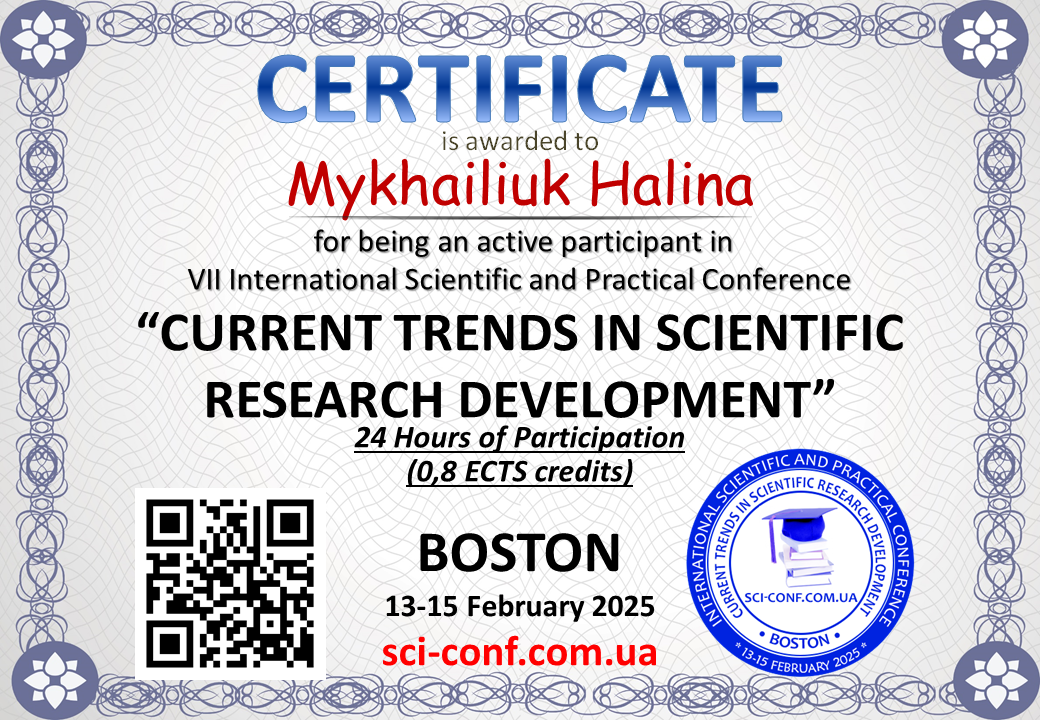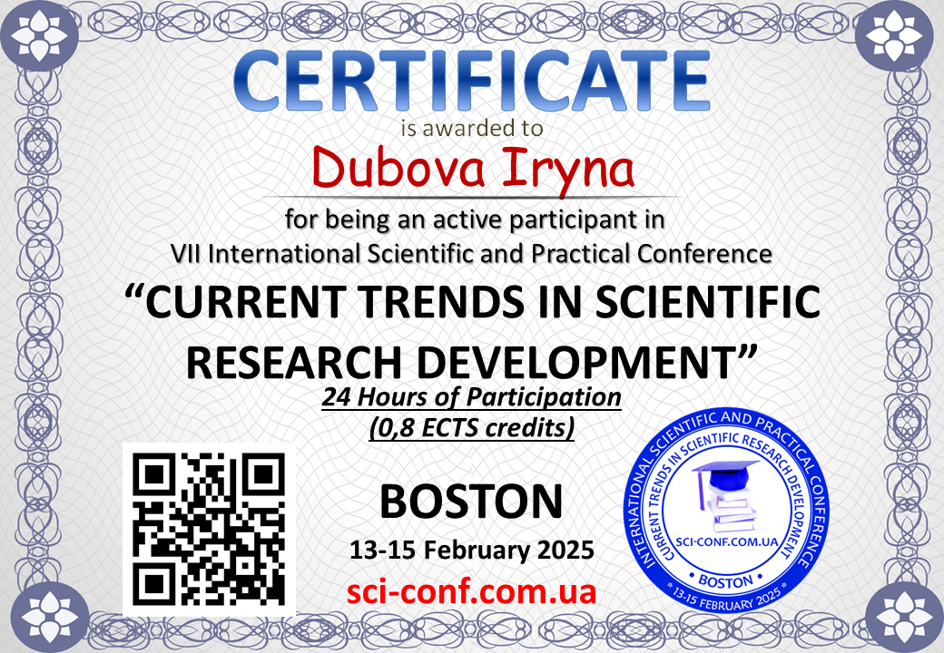 Tykholaz S.I., Ratova V.R., Mykhailiuk H.T., Dubova I.O. LATIN LANGUAGE AND MEDICAL TERMINOLOGY IN THE GENERAL SYSTEM OF PHYSICIAN TRAINING / Tykholaz S.I., Ratova V.R., Mykhailiuk H.T., Dubova I.O. // The 7th Internationale scientific and practical conference “Current trends in scientific research development” (February 13-15, 2025) BoScience Publisher, Boston, USA. 2025. P. 463-465