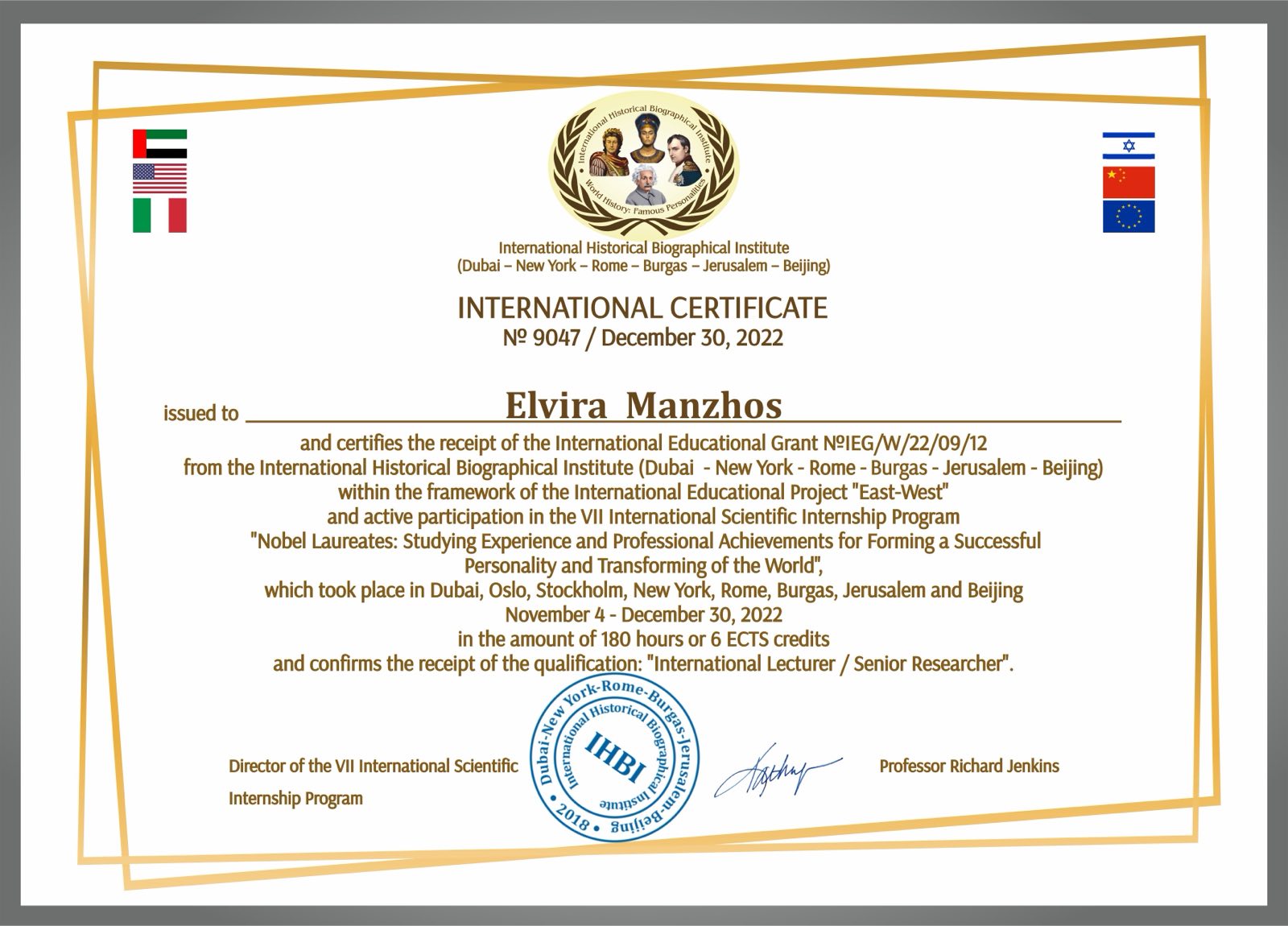 VII Міжнародна програми наукового стажування «Nobel Laureates: Studying Experience and Professional Achievements for Forming a Successful Personality and Transforming of the World» («Нобелівські Лауреати: вивчення досвіду та професійних досягнень для формування успішної особистості та трансформації оточуючого світу»), яка була організована Міжнародним Історико-Біографічним Інститутом в рамках міжнародного освітнього проекту «Схід-Захід» в Дубаї, Осло, Стокгольмі, Римі, Бургасі, Нью-Йорку, Єрусалимі та Пекіні, 4 листопада – 30 грудня 2022р. (тривалість навчання 6 ECTS/180 год). Сертифікат №9047 від 30.12.2022.