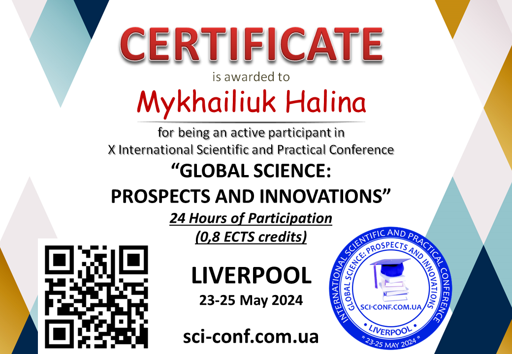 XІІ Міжнародна програма наукового стажування «Together with Prominent Leaders of Our Time: Values, Experience, Knowledge, Competencies and Technologies for the Development of a Successful Person and the Transformation of the World Around Us» («Разом із Визначними Лідерами Сучасності: Цінності, Досвід, Знання, Компетентності і Технології для Формування Успішної Особистості та Трансформації Оточуючого Світу»), яка була організована International Historical Biographical Institute (Dubai – New-York – Rome – Burgas – Jerusalem – Beijing), 7 квітня – 27 травня 2023р., тривалість навчання 6 ECTS/180 годин (з них 15 годин інклюзивної освіти/0,5 кредиту ECTS). Сертифікат №12232 від 27.05.2023.