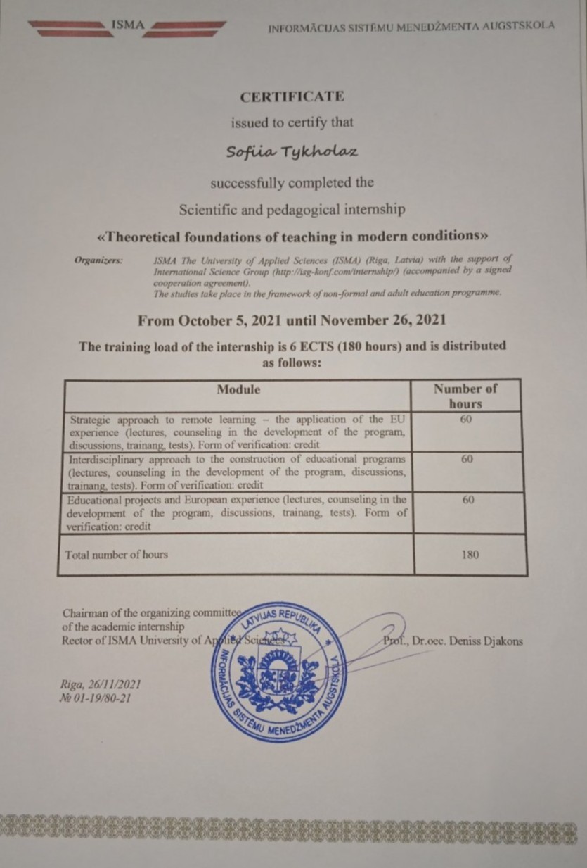 Scientific and pedagogical internship “Theoretical foundations of teaching in modern conditions” (ISMA The University of Applied Sciences (ISMA) (Riga, Latvia) – 6 ECTS (180 hours) 05.10.21 – 26.11.21. Науково-педагогічне стажування «Теоретичні основи викладання в сучасних умовах», Університет ISMA, Рига, Латвія. Сертифікат № 01-19/80-21 від 26.11.21.