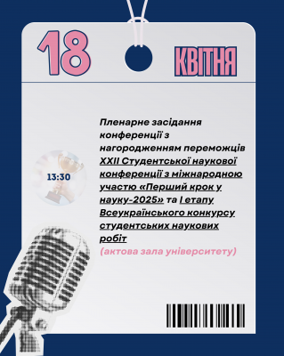 13:30 — Пленарне засідання з нагородженням переможців конференції та І етапу Всеукраїнського конкурсу студентських наукових робіт